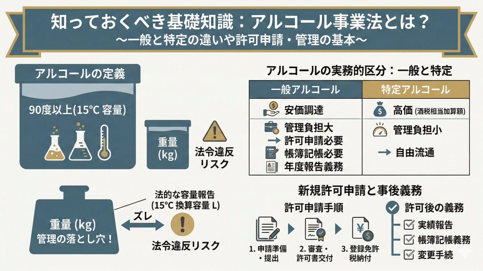 本記事では、元化学研究者の視点を交え、複雑な「一般アルコール」と「特定アルコール」の違いから、事業開始に必要な許可申請の手続き、そして許可取得後に求められるコンプライアンス管理(帳簿・報告義務)まで、事業を安全に運用するための必須知識を解説いたします。