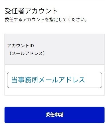 • 「委任先一覧」画面が開きます。「受任者アカウント」(行政書士を指します)の欄に、当事務所のメールアドレスを入力し、「委任申請」ボタンを押してください。