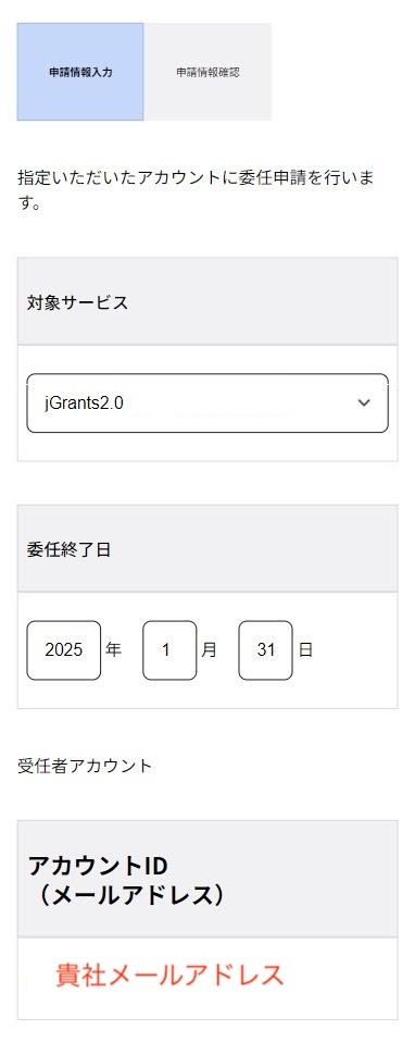 • 委任終了日:事前に相談した日付を入力します。 入力できたら、再度「委任申請」ボタンを押します。
