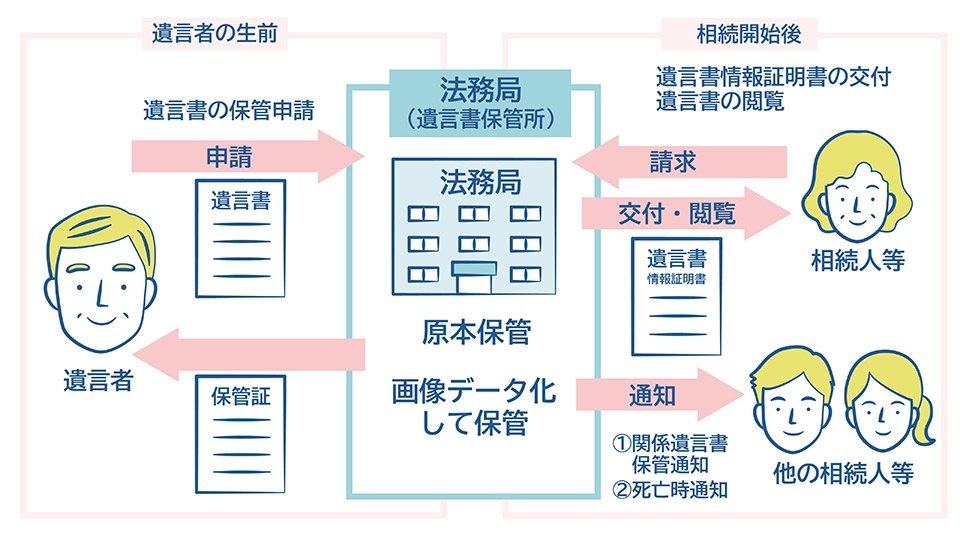 • 遺言者があらかじめ希望して指定しておけば、遺言者の死亡が確認された際、指定された方に法務局から遺言書が保管されている旨が通知されます。