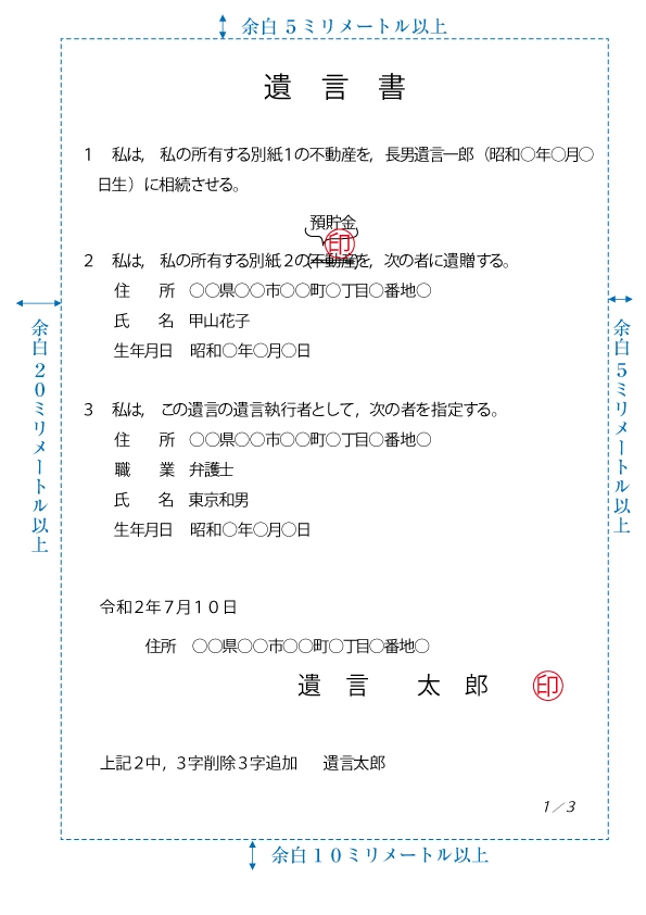 • 全文、日付、氏名を自書し、押印(認印可)すること。財産目録はパソコン作成やコピー添付も可能ですが、その場合は目録の全ページに自署・押印が必要です。