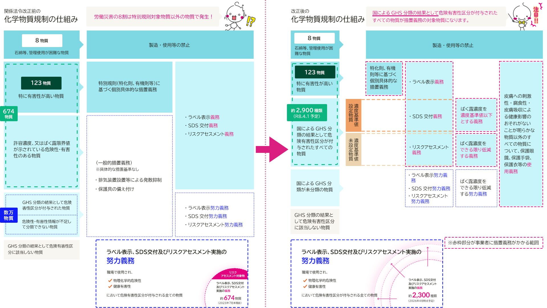 近年、日本の化学物質管理は従来の「個別規制型管理」から、事業者が自らリスクを評価・対策する「自律的な管理」へと大きく方針転換しました(2022年政省令改正)。さらに2025年5月には労働安全衛生法(安衛法)自体が改正・公布され、SDSの通知義務違反に対する罰則が新たに設けられました。